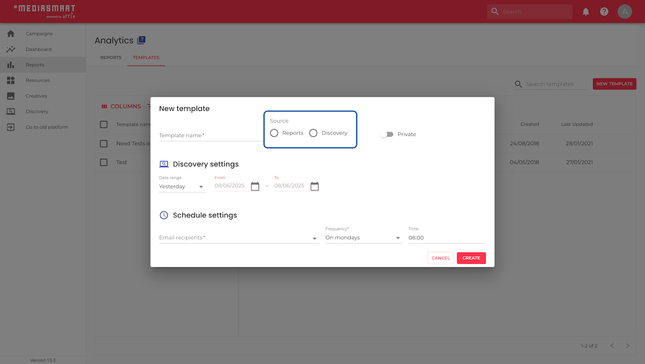 Template settings. The configuration fields will change if it's a Reports or a Discovery template. Keep reading for more information.