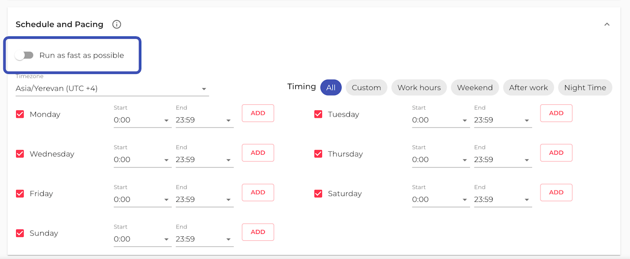 You can activate Run as fast as possible in the Schedule and Pacing section within Properties on any of your campaigns.