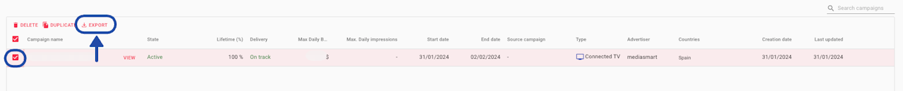 The system will automatically download a .csv with the displayed information (all the shown columns), plus the campaign ID.