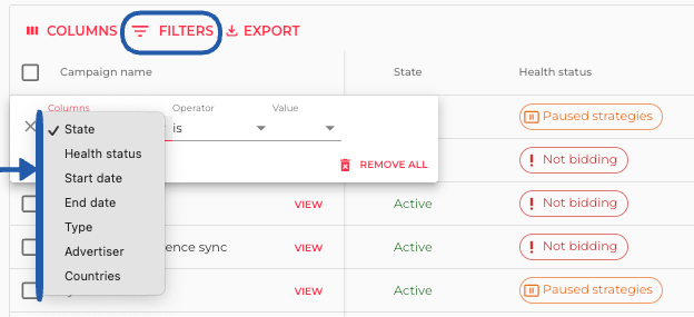 You can filter the displayed Campaigns by: