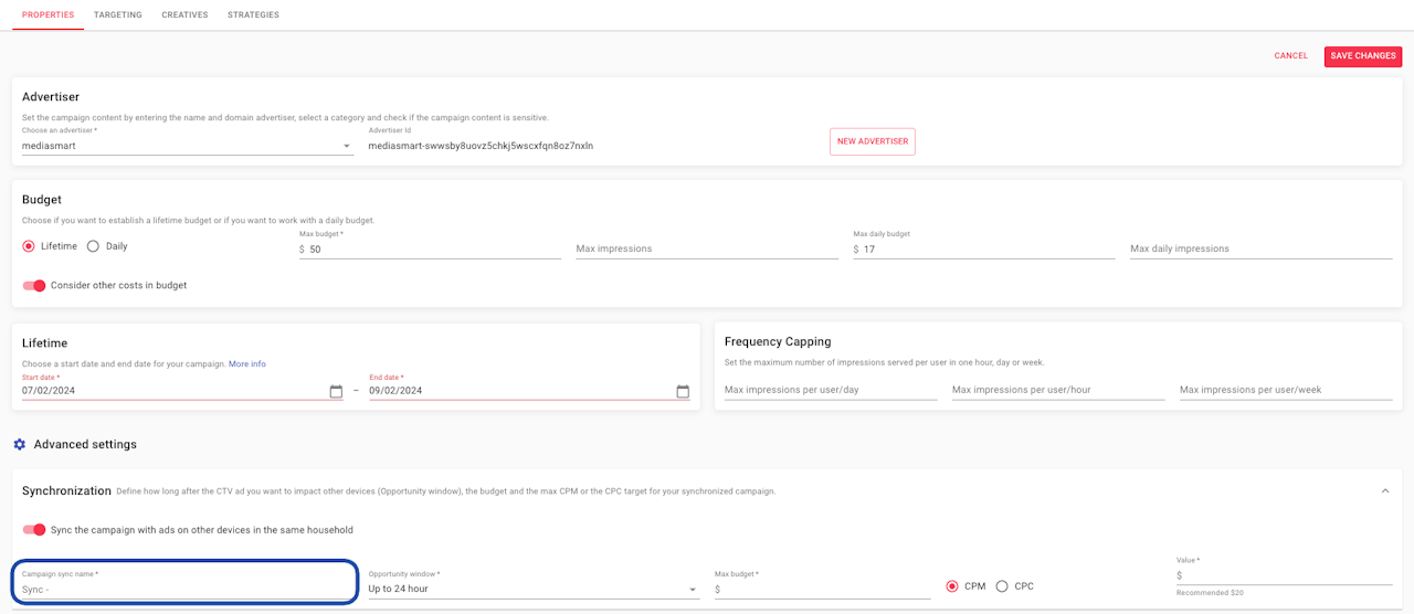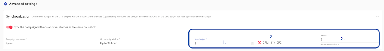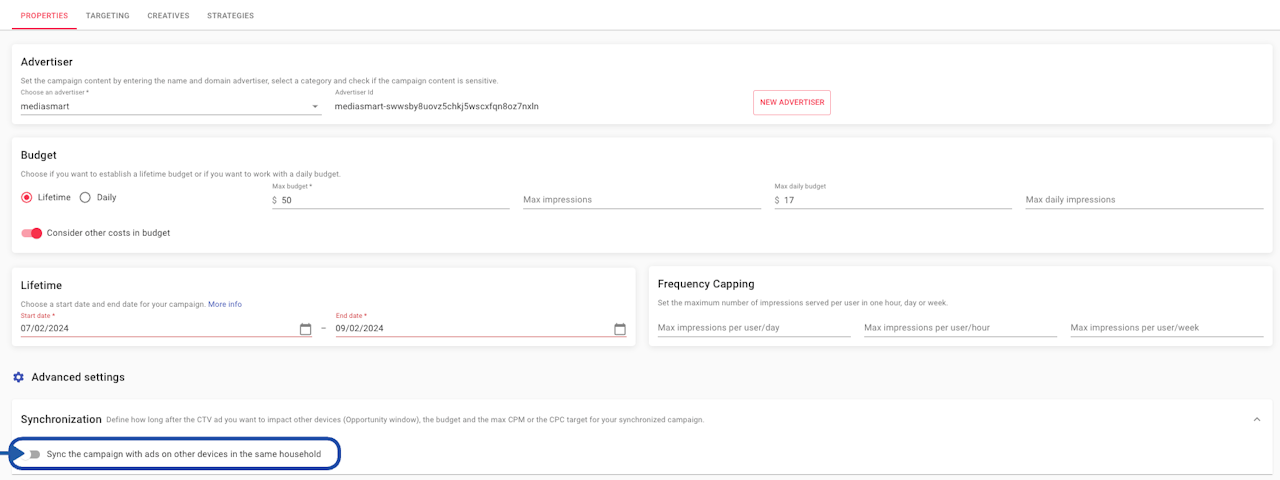 CTV Synchronization is part of the Advanced settings of any of your CTV Campaign Properties. This section will enable you to perform Household Sync: syncing your CTV ads with ads on other connected devices, like Mobile or Desktop, within the same household.