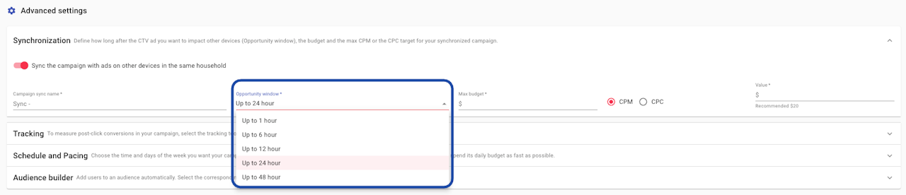 You will be able to select an Opportunity Window. That is to say, the time you want elapsed between the CTV ad and the ads on the other connected devices within the same Household.