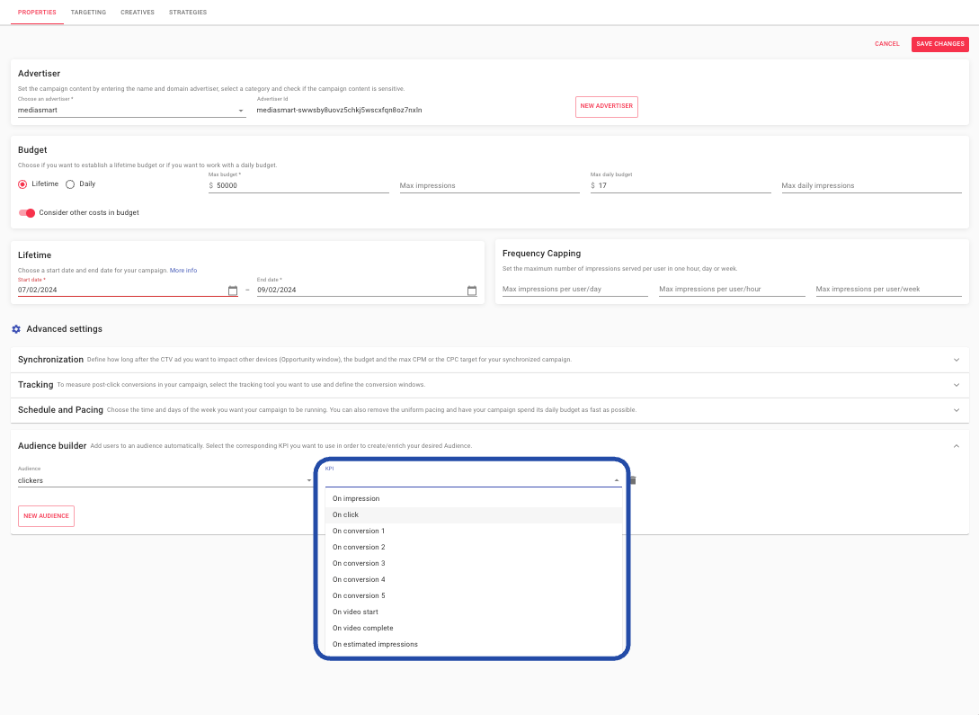 Once you are in the Properties area of any of your campaigns, it is very straightforward to create Interaction-based audiences: