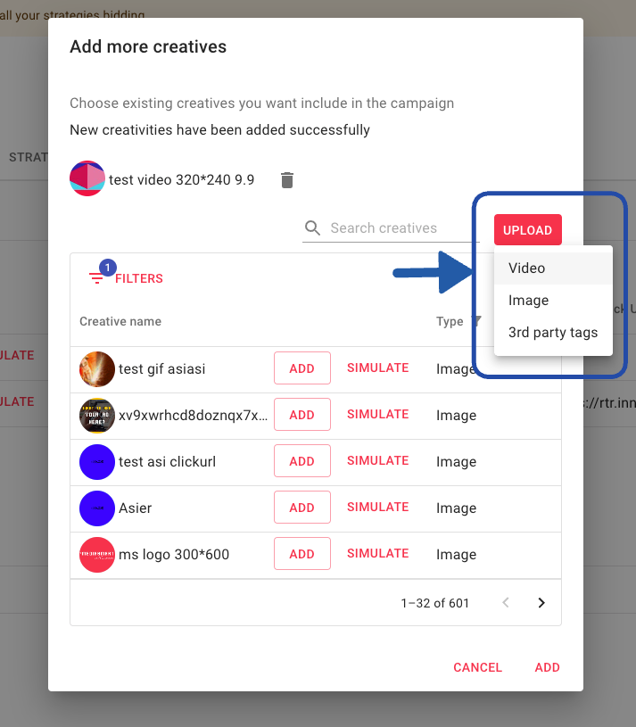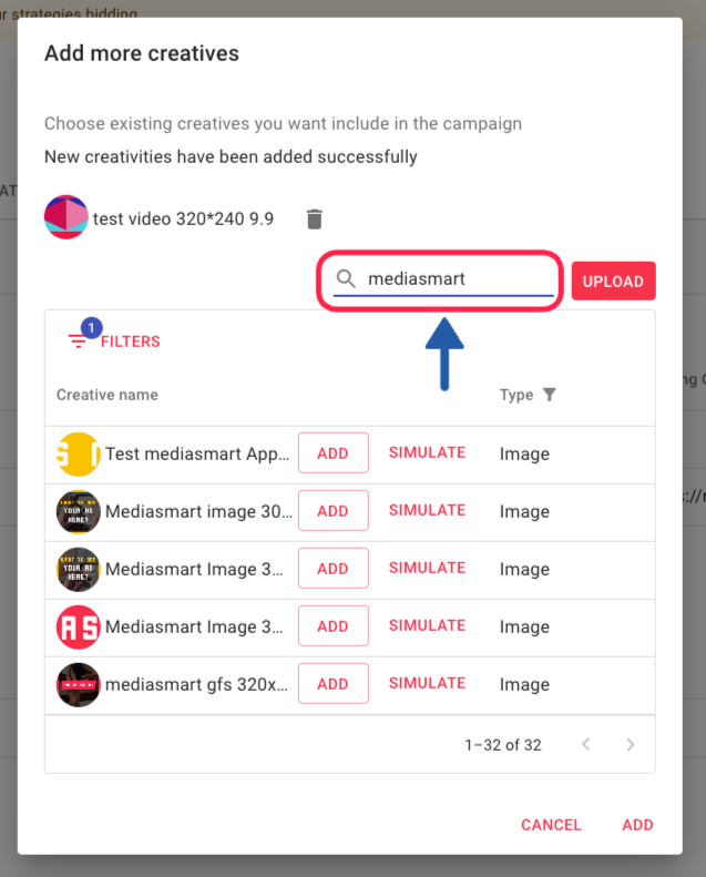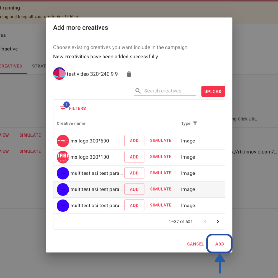 Once happy with your selection, click on 'Add' at the bottom part of the dialog, so it adds the creatives and you can go back to the Creatives Table