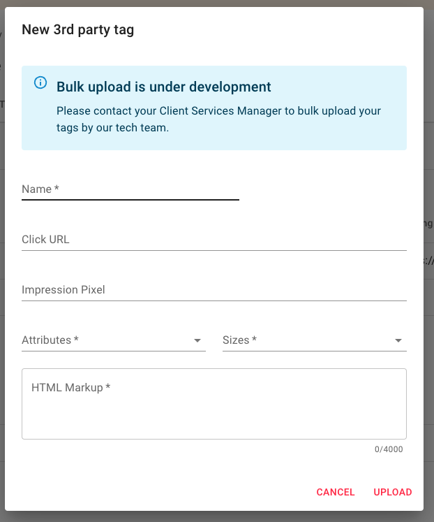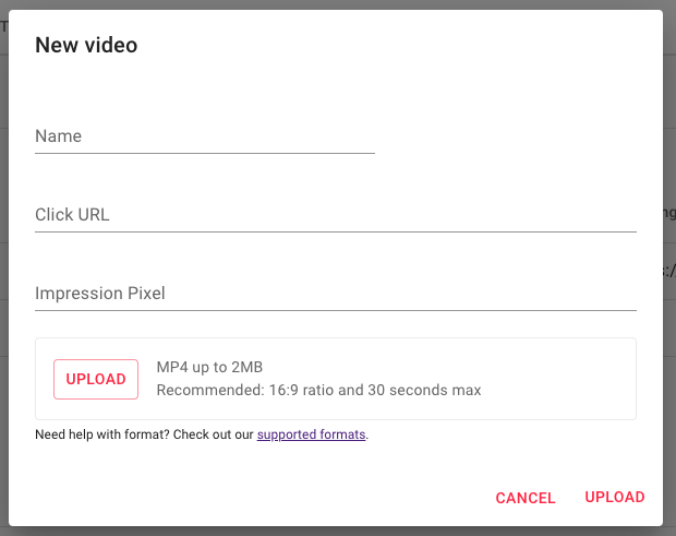 When you click on 'Upload new' you will need to select the type of creative you want to upload. This will open different dialogs depending on the creative type, to request the information we need.