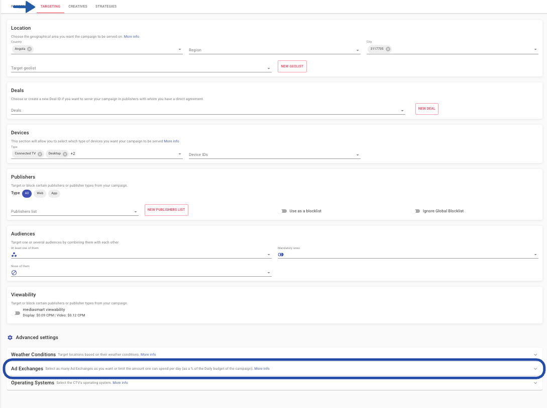 By opening the Ad Exchanges section, you will be able to select or unselect the partners you want to target.
