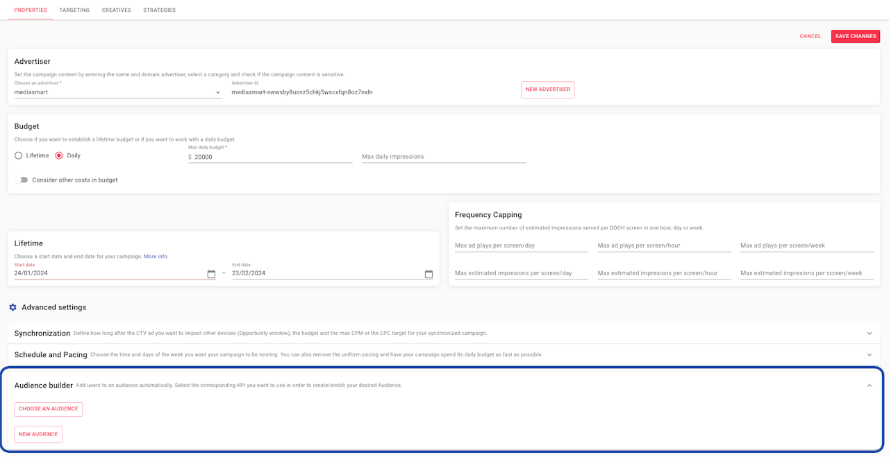 You can create DOOH audiences from the 'Audience Builder' section on the Properties area of any of your DOOH campaigns.