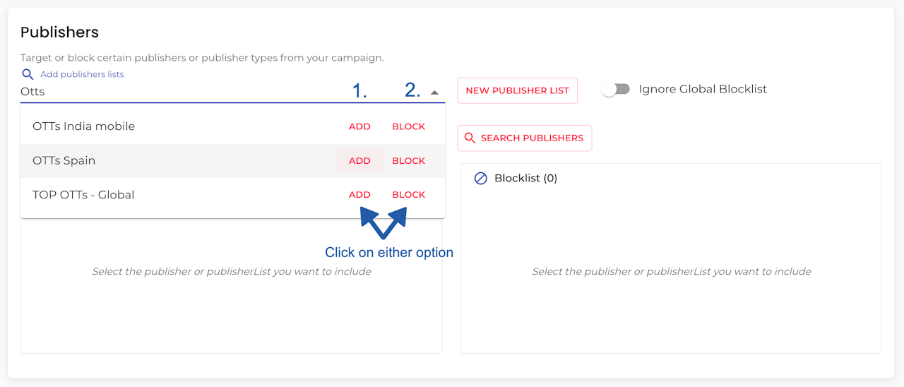 Quickly add a single publisher to an allowlist or blocklist without creating lists. Just type the name and click ‘Add’ or ‘Block’ in the dropdown.