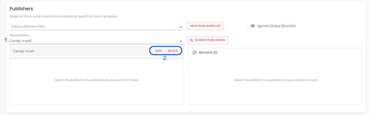 Search Publishers to target or block, using the dialog that will appear when you click on 'Search Publishers'. Keep in ming this option is available for every campaign type, except DOOH.