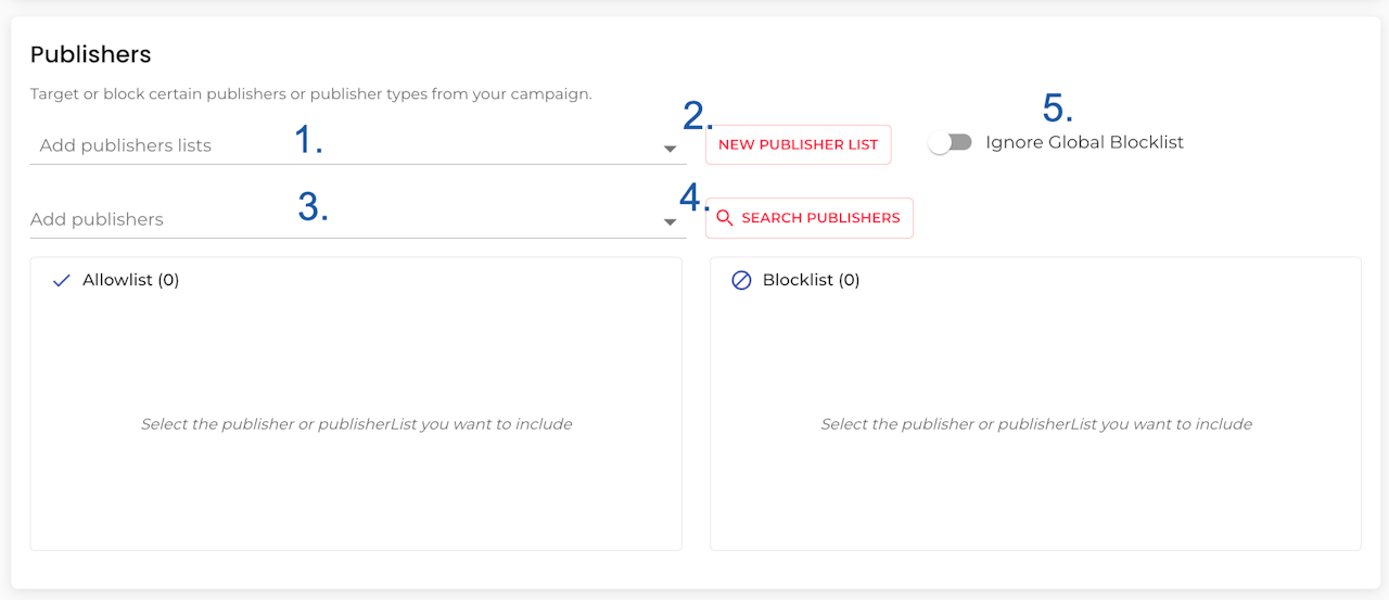 In this section, you can choose the publishers you want to target on your campaigns, used as allowlist, or which should be blocked.
