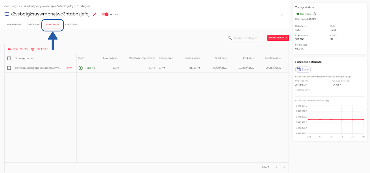 The Strategies area of your Campaign will allow you to run the campaign, A/B test elements and targeting options, run different line items, and establish budget and pricing.