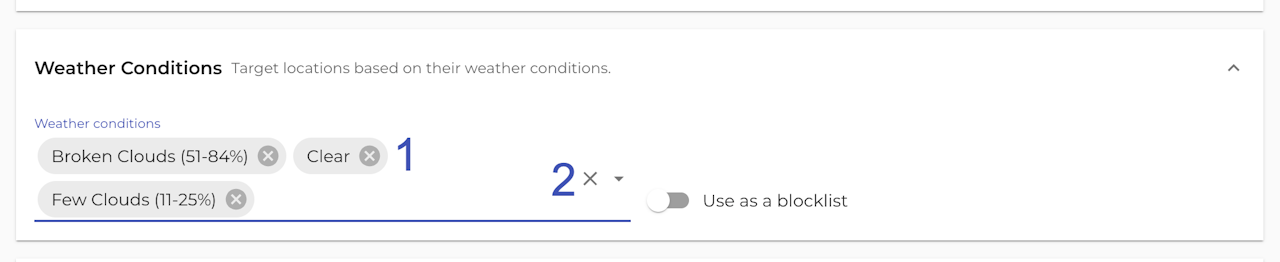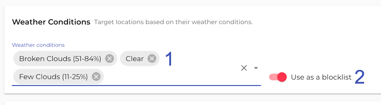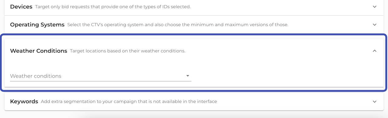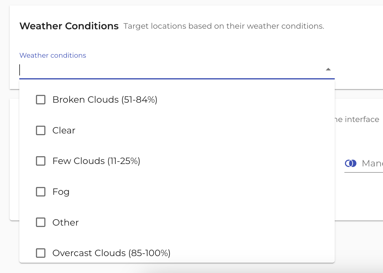 Weather conditions are available for all types of campaigns and are compatible with any other targeting option.