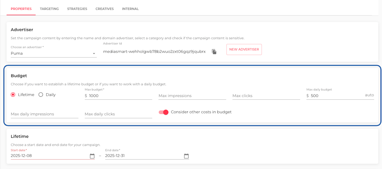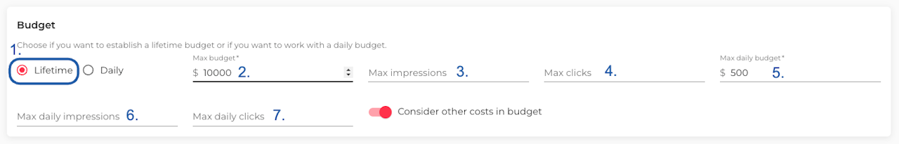 In this section, you can set caps on spend, impressions, or clicks—either per day or over the campaign lifetime.