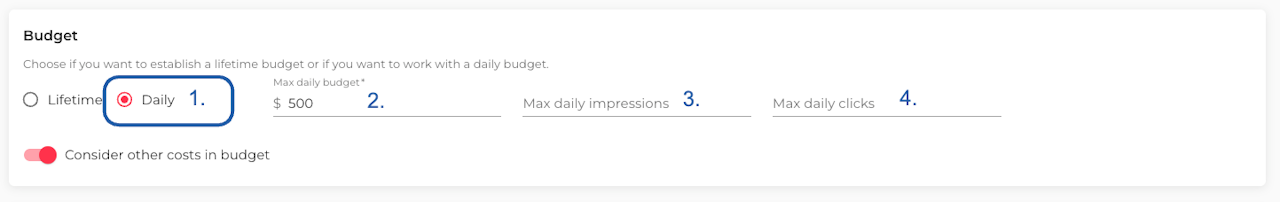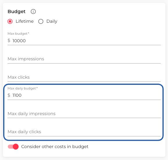 (Optional) Add a daily spend limit. If you don't manually set it, the system will calculate it based on the Campaign Lifetime, and automatically compensate when not reached.