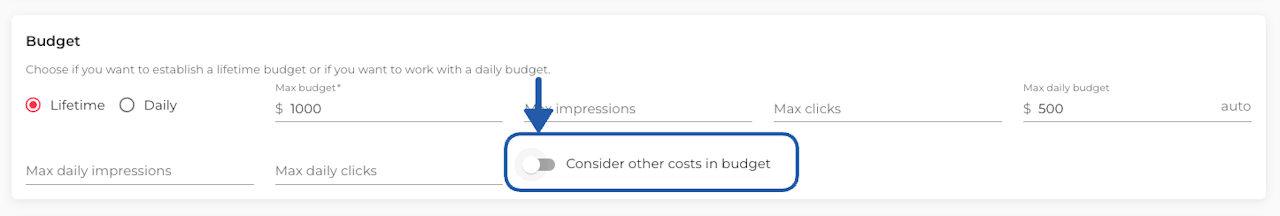 When enabled using the switch, the campaign budget will account for both media spend and any additional charges generated by the campaign.
