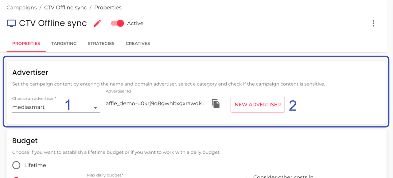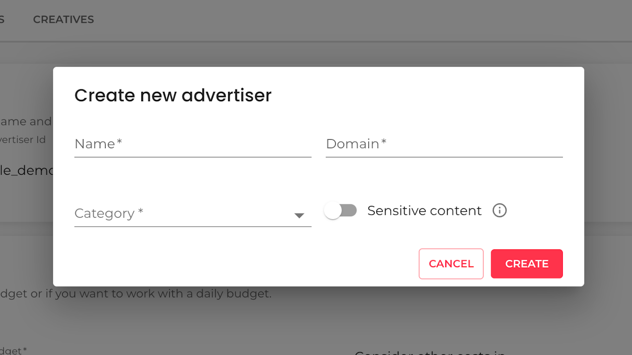 When you click on the 'New advertiser' button, a menu will appear for you to create a new advertiser.