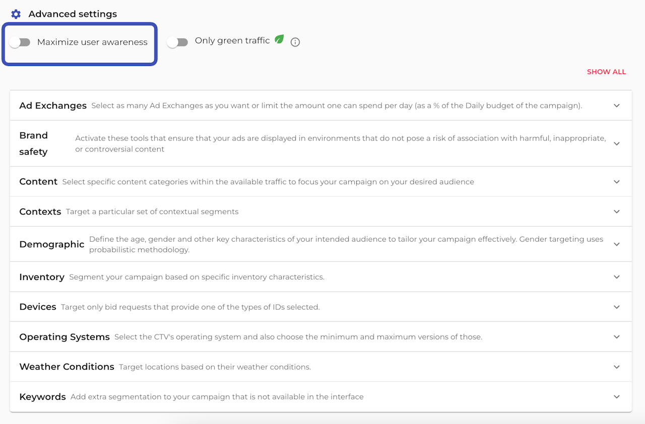 Our proprietary, patent-pending, Maximize User Awareness feature can be enabled through a single-click, by clicking on the switch available under 'Advanced settings' of your campaign.