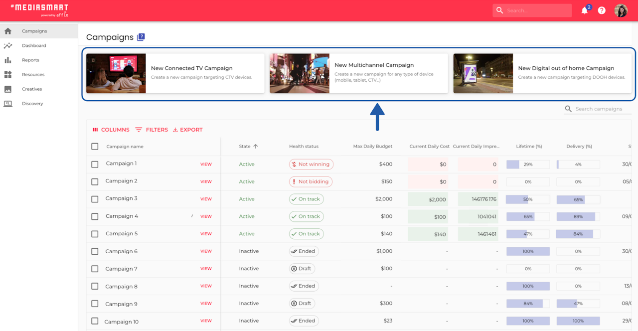 In the top part of the Campaigns area, you will see several buttons that you can press to generate new campaigns, as shown in the screenshot. By clicking on any of those buttons, you will access a Campaign Launcher.