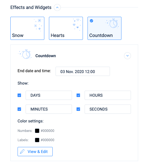 Effects & Widgets, which include effects over the ad, and even a countdown.