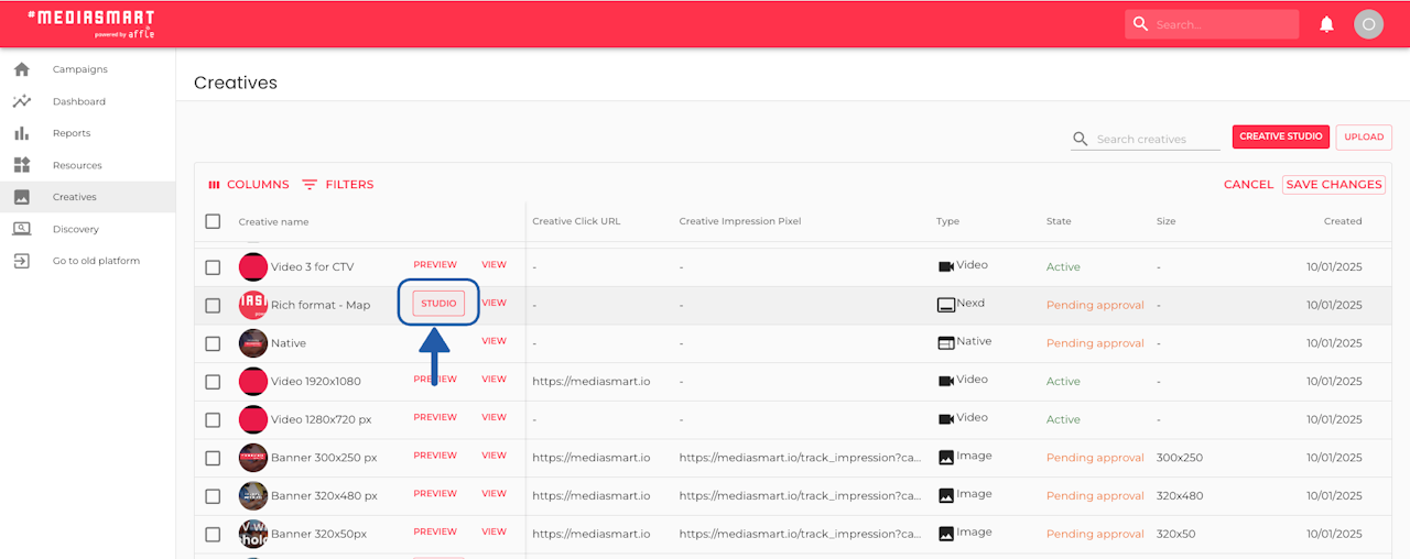 To edit your creatives anytime, click the 'Studio' button in the Creatives Table under the Creative section.