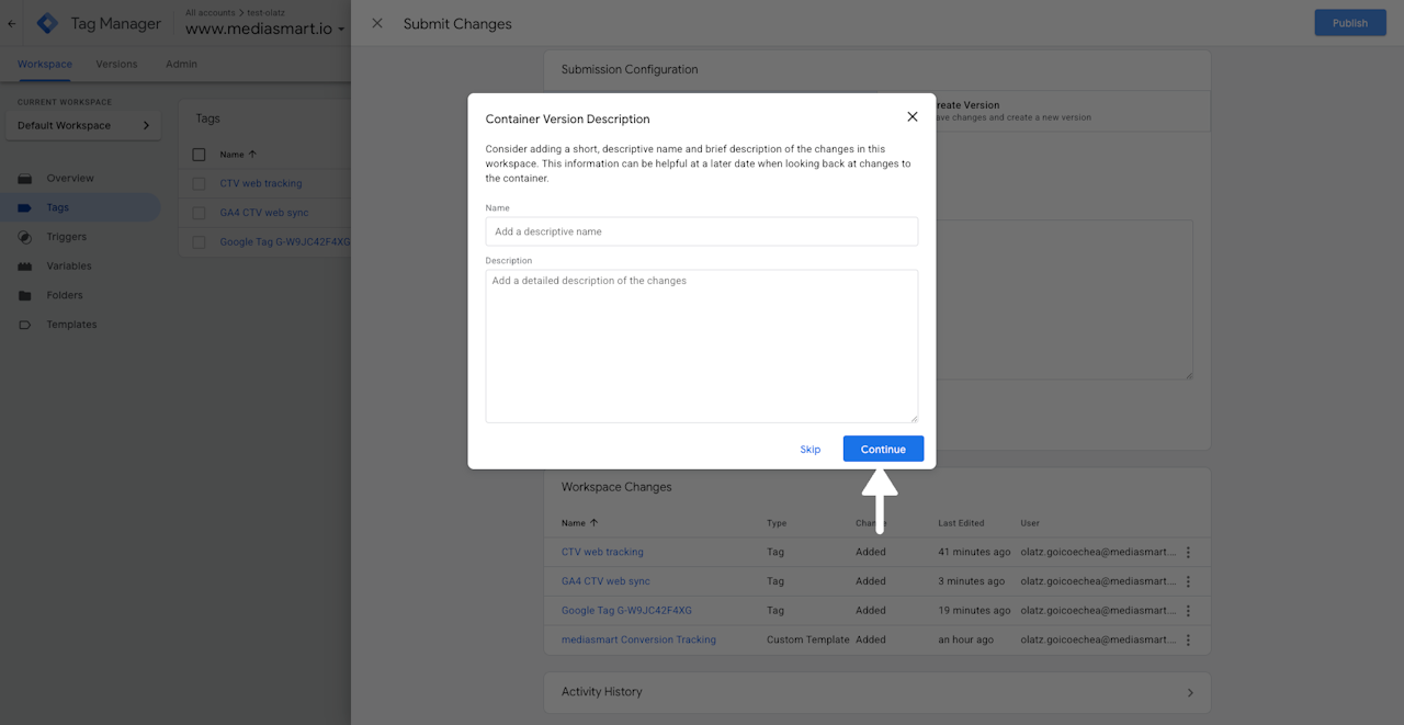 A dialog will appear asking you to add a version name and description for your GTM changes. You can make it as detailed as you like or skip it by clicking 'Continue'. This information is for internal use only.
