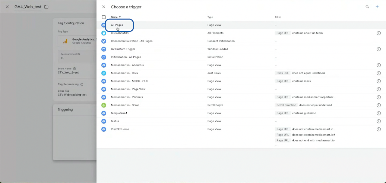 Select the Event you created earlier in Google Tag Manager (see section B, step 25 for details). This event will define your audience. If you followed our recommendation to include ‘CTV’ and ‘mediasmart’ in the name, search using those terms.