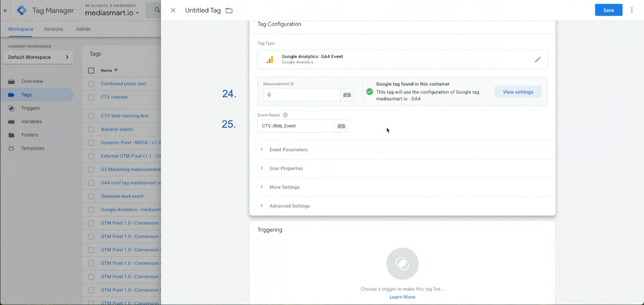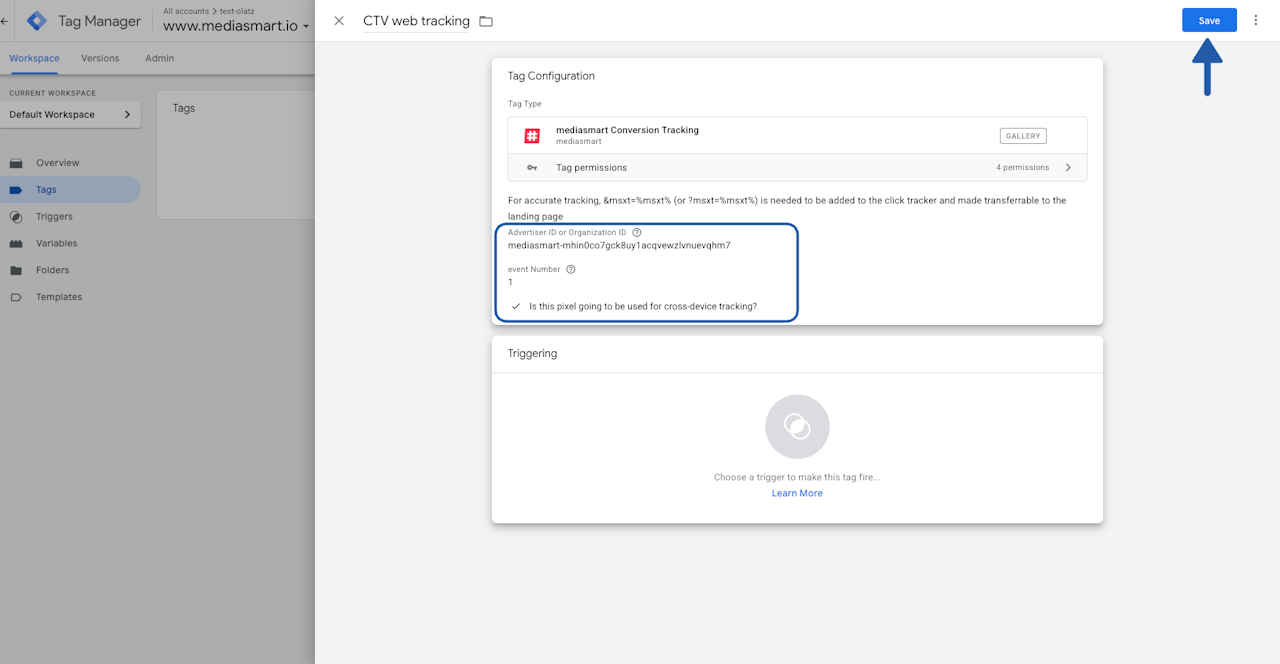 Under Setup Tag, select the previously created mediasmart Conversion Tracking tag