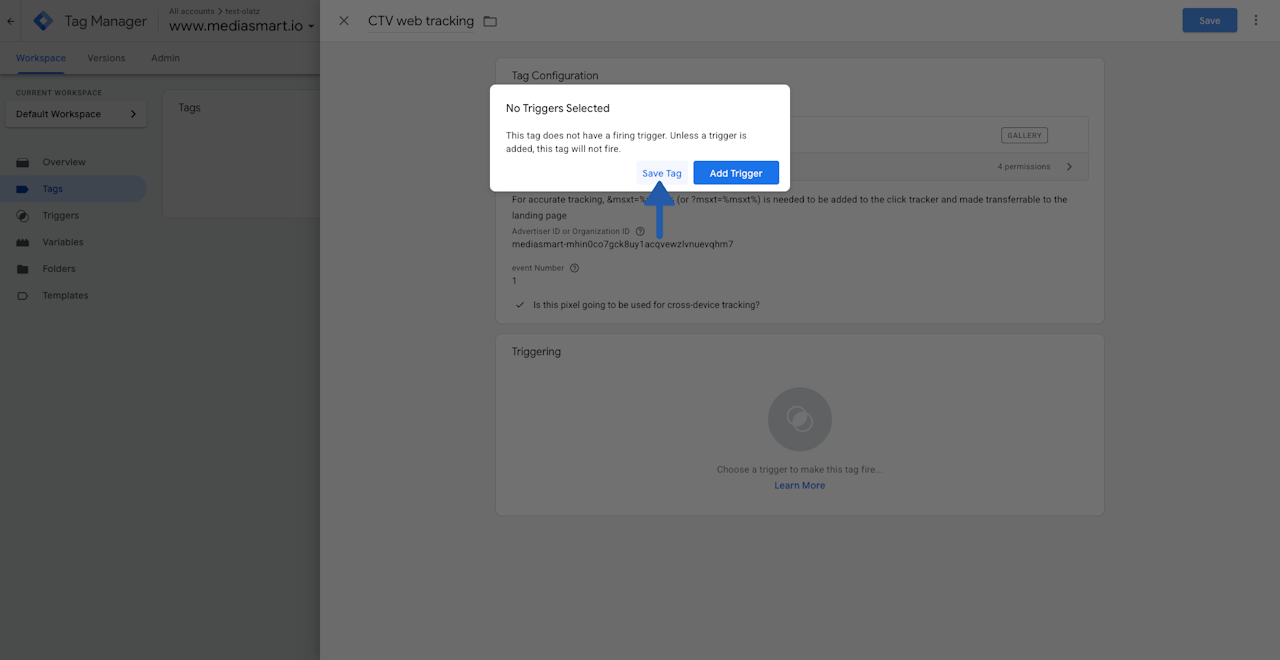 A dialog will appear, click on 'Add tag'. Please, do not add a trigger.