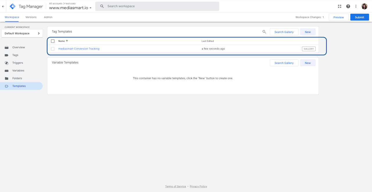 Once correctly added, you will see the 'mediasmart Conversion Tracking' tag template as part of your tag templates.