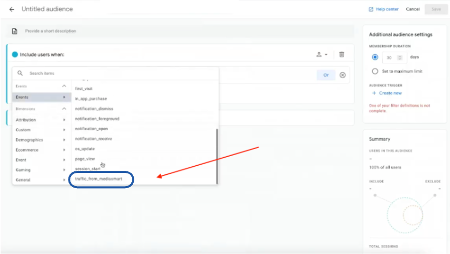 Select the Event you created earlier in Google Tag Manager (see section B, step 25 for details). This event will define your audience. If you followed our recommendation to include ‘CTV’ and ‘mediasmart’ in the name, search using those terms.