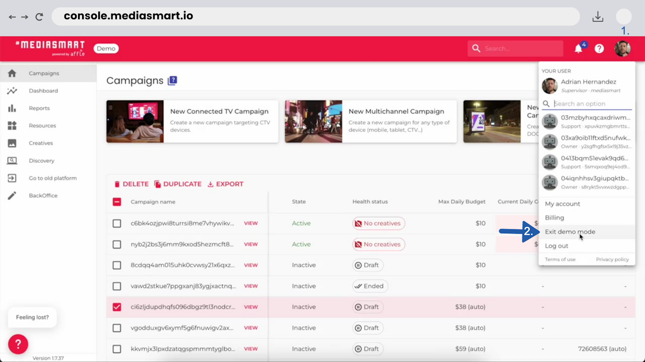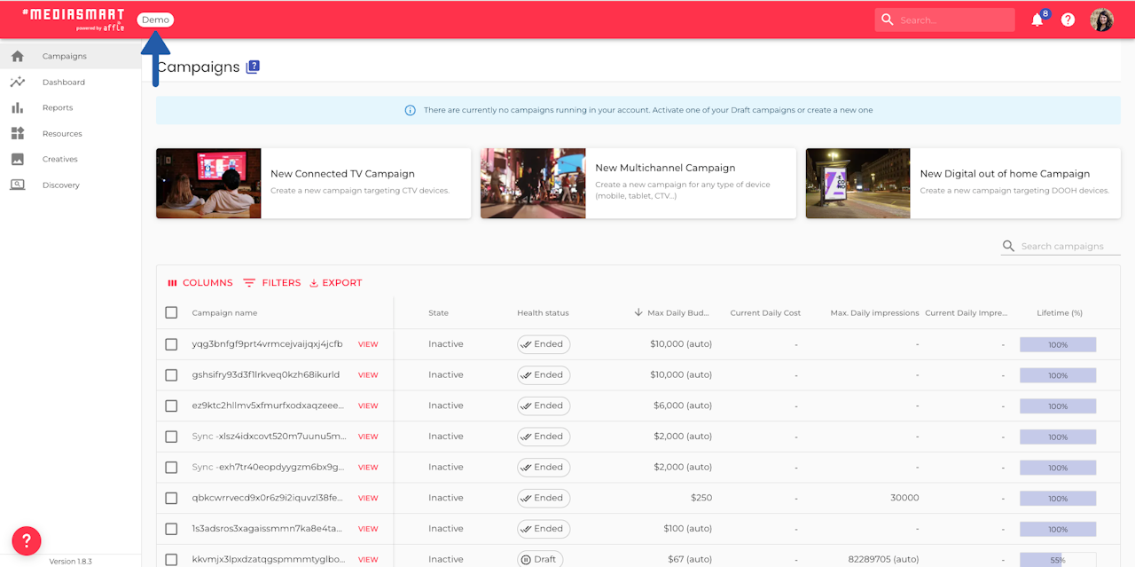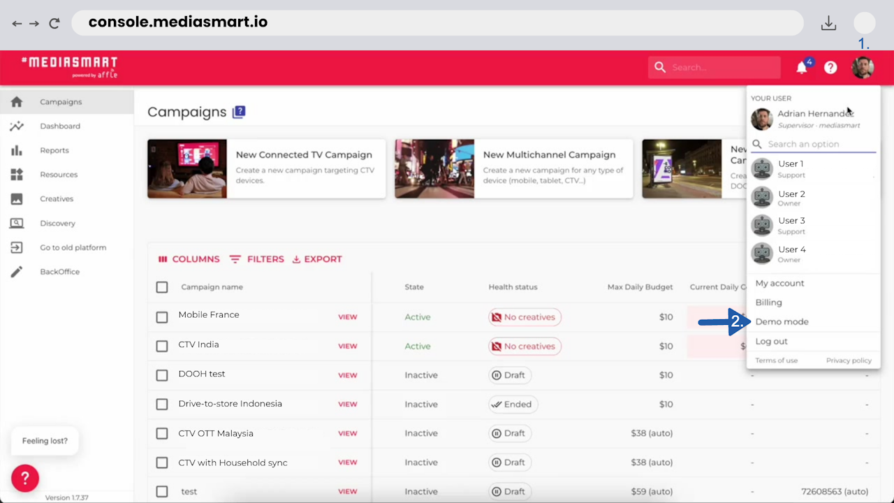 Demo -prefix before it, be it campaign, audience, creative, or any other resource. Feel free to erase or keep them.Remember that changes made in Demo mode won’t be saved. If you realize a real configuration change is needed, please exit Demo mode and make the update there.