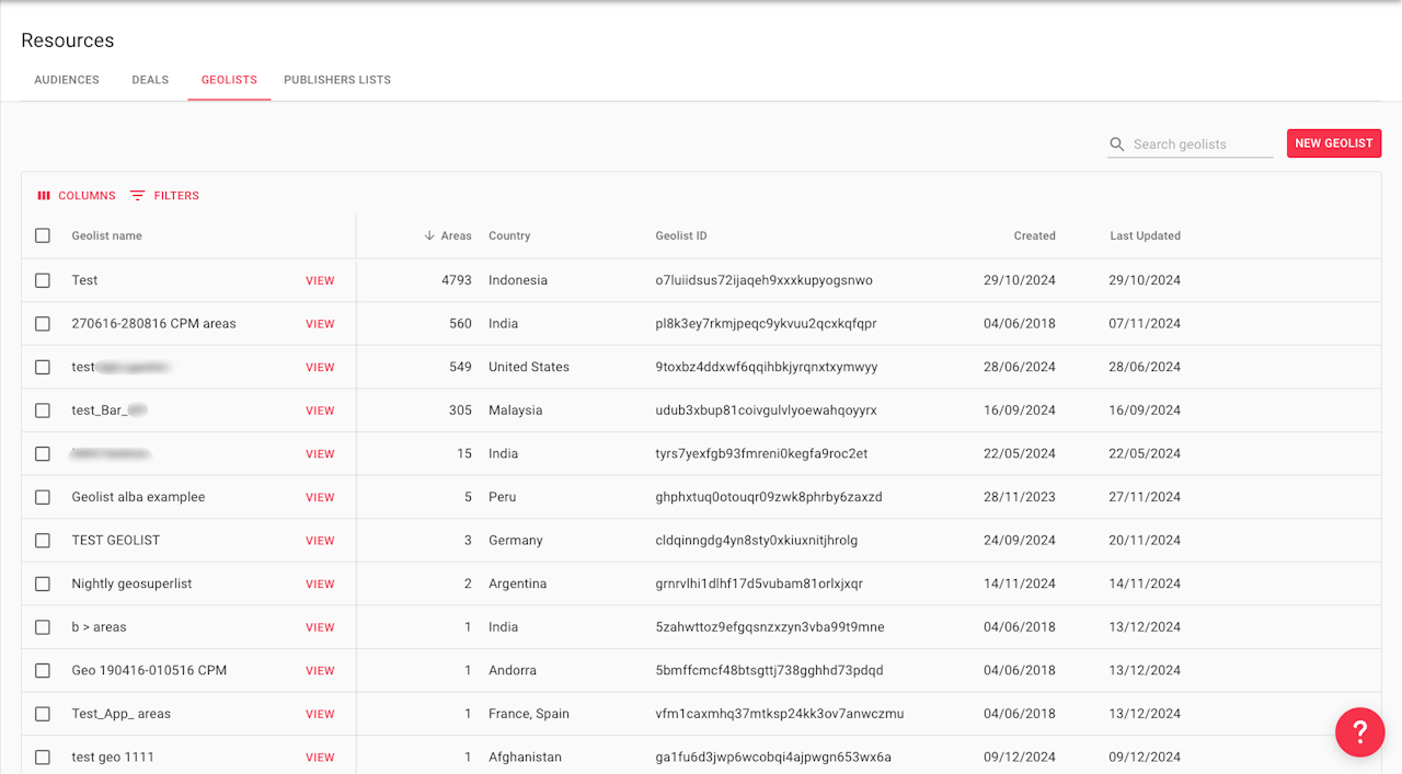 The Geolists section within Resources is where you can upload, and manage Geolists to be used in campaigns.