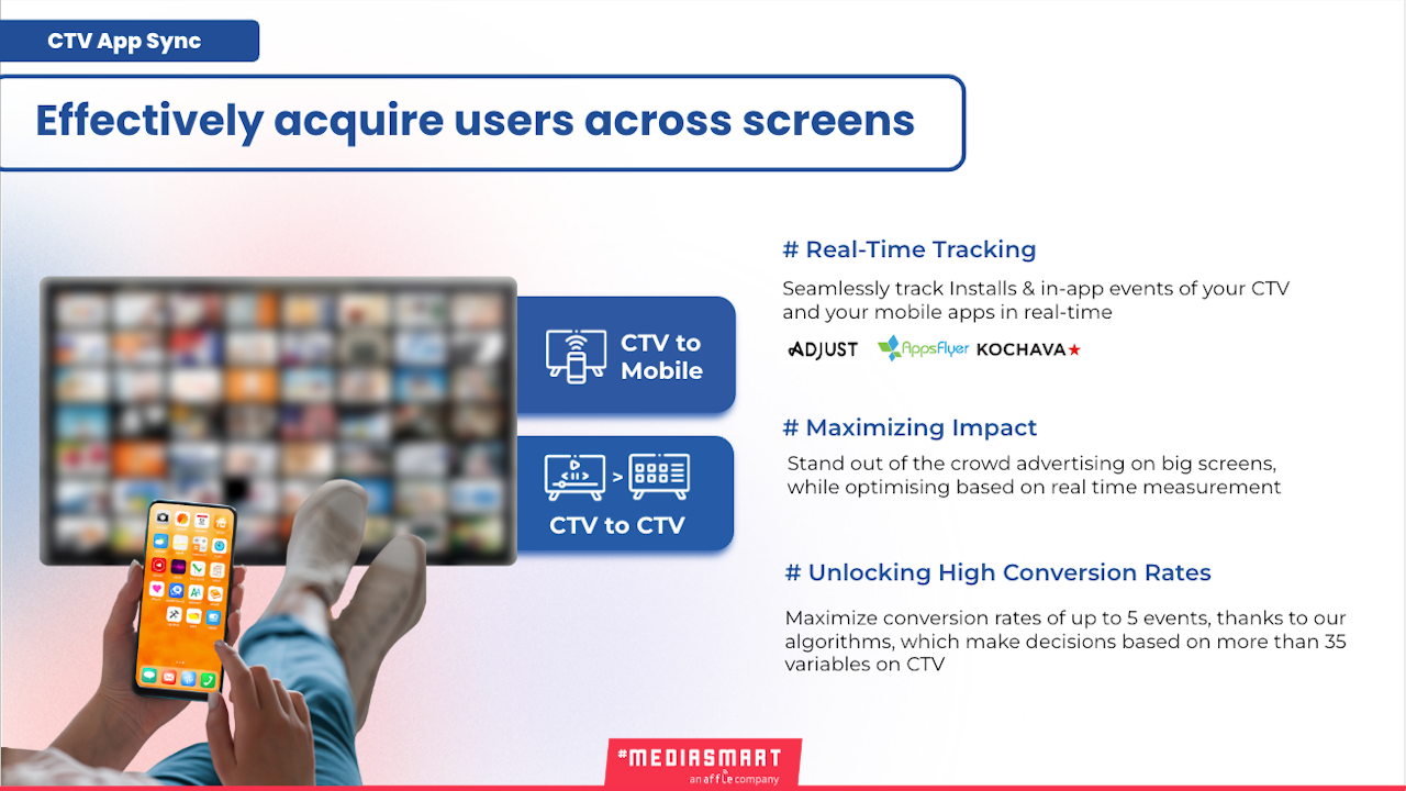 With mediasmart' CTV App Sync and our integrations with the main MMPs, you can place an ad on a CTV and track app conversions (installs or other engagements) either on Mobile or CTV.