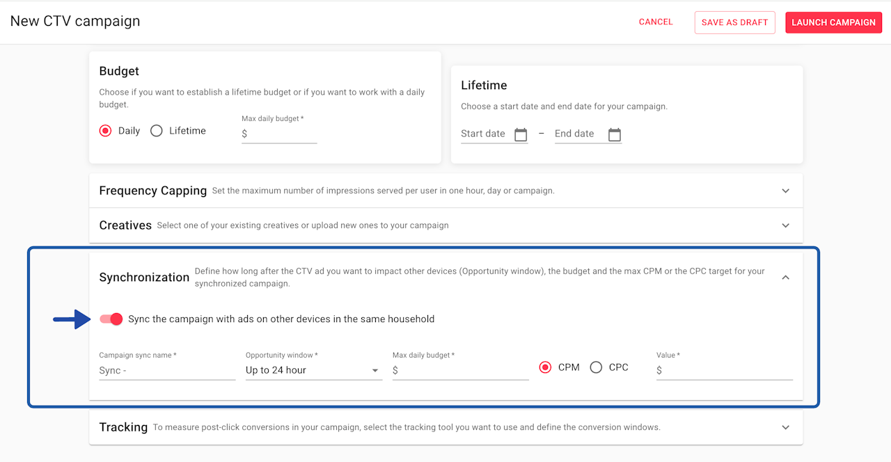 Proceed to add your Targeting, Creatives, and Strategies, both on the Connected TV and the Synced campaign.