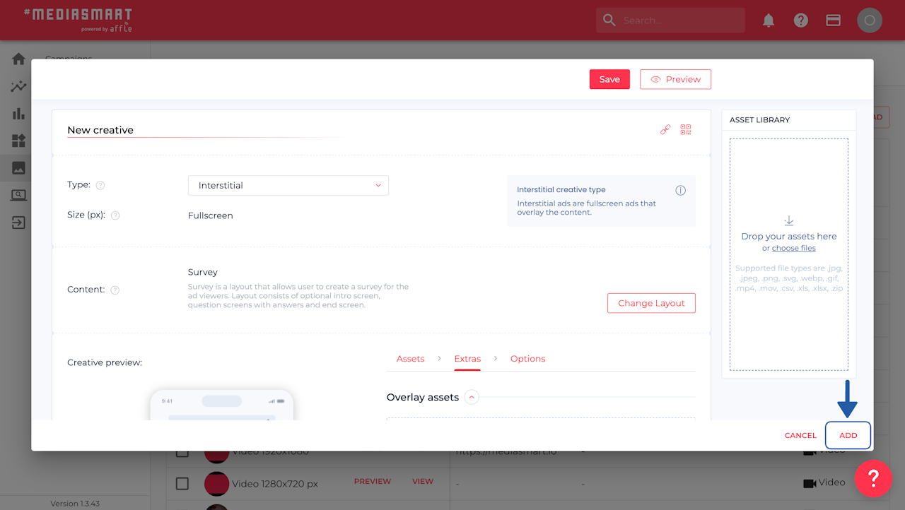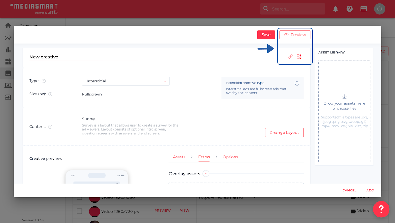 Click on the 'New creative' button to generate a new survey ad.