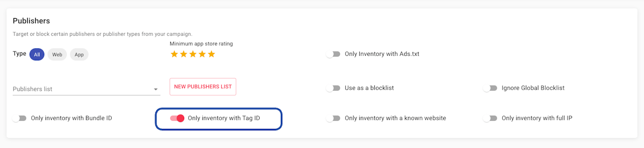 If you intend to retarget specific placements from a live campaign, we recommend you to switch ON the target 'only inventory with Tag IDs' toggle within the Publishers section on Targeting.