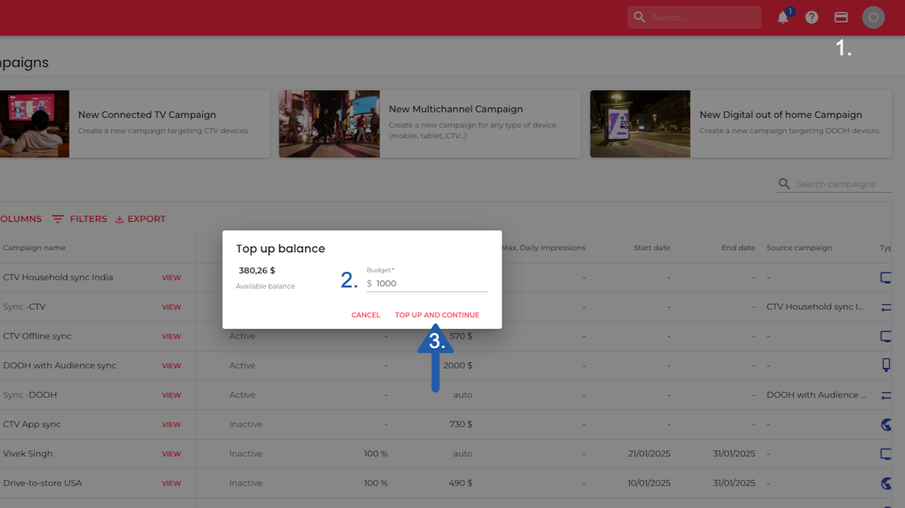 Balance represents the available funds in your account that can be used to run advertising campaigns.