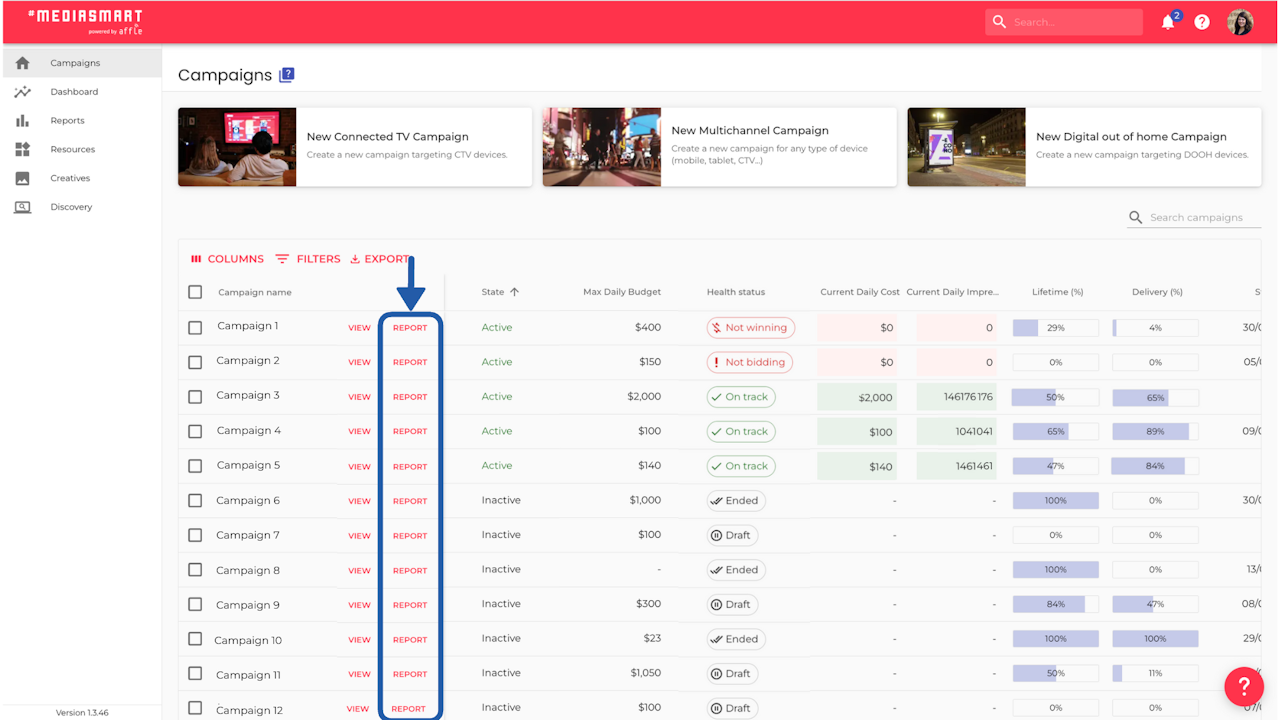 One-Click campaign reports are here: Save precious time with the new "Report" button right next to your campaigns in the main table. Instantly download a performance report for any running campaign without having to build it manually.