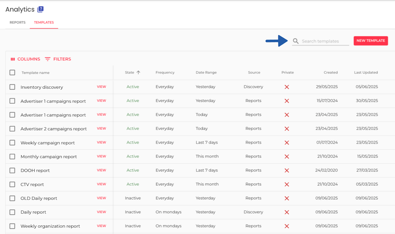 You can search Templates at any time, by typing in the Search bar on the top right part of the Templates Table