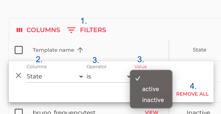 Click on the 'Filters' button (1) and select the columns (2), operator (3), and values (4) you want