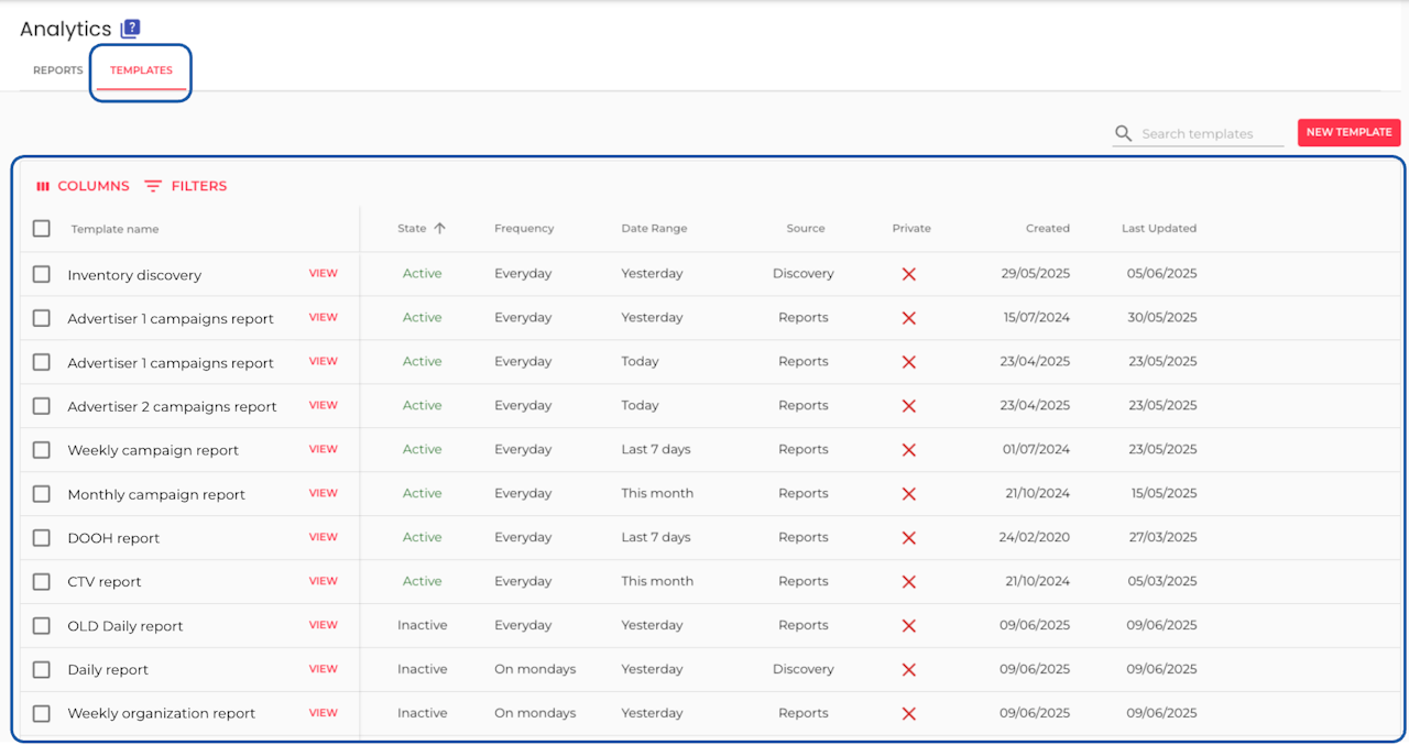 Only the filtered templates will appear as rows on the table.