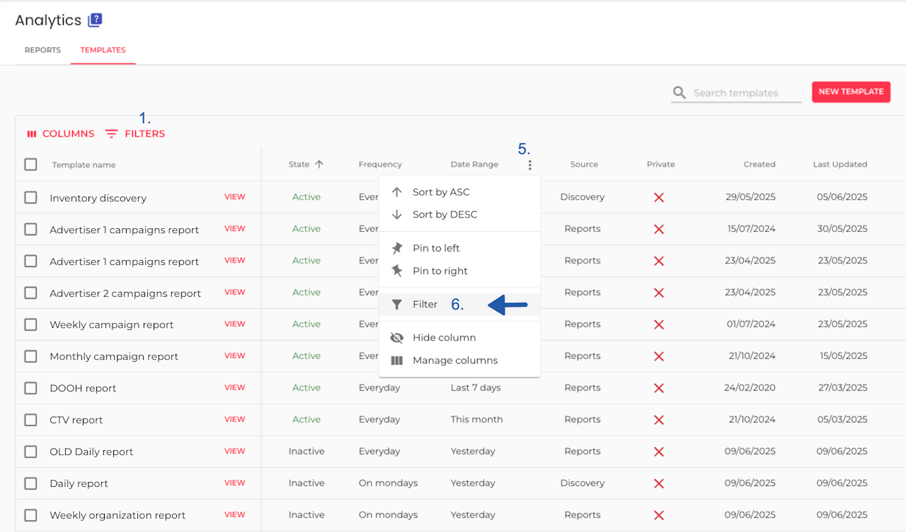 Click on each column's header ellipsis (5) and then filter (6).
