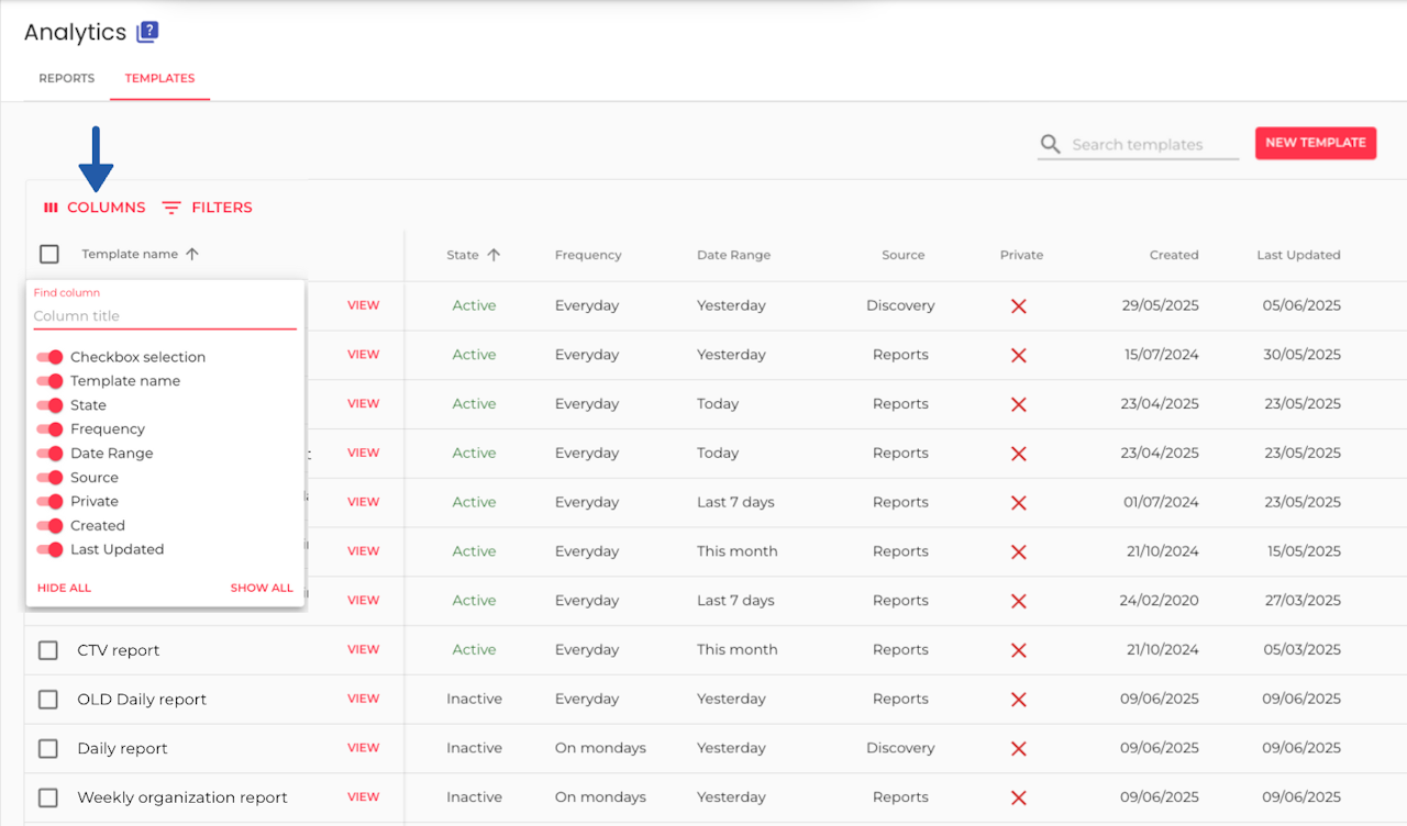 You can easily choose which columns you want to display by clicking on 'Columns' and clicking on the switch before all the column options in the dropdown menu.
