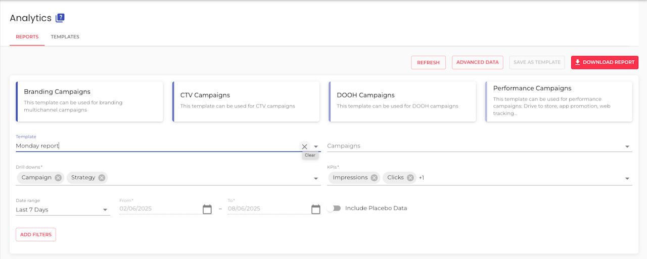 Choose from mediasmart’s pre-built templates, tailored by campaign type to save you time and boost insights, or tap into your own saved templates and rerun reports with just one click.