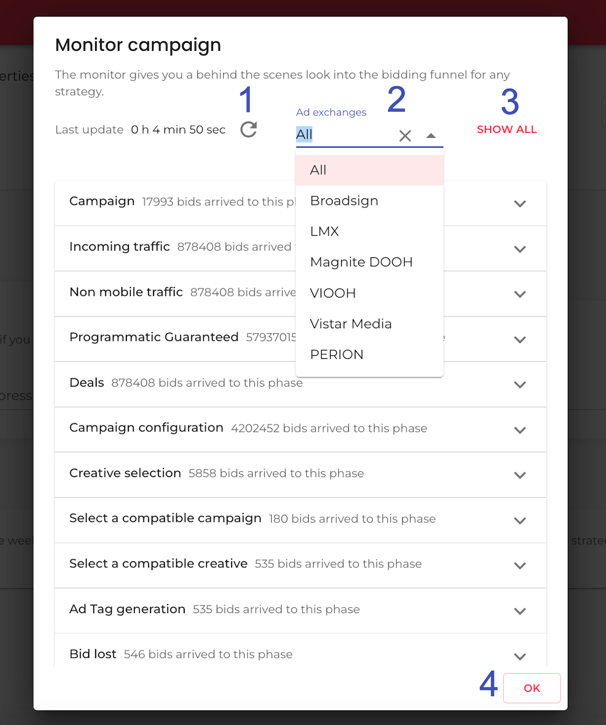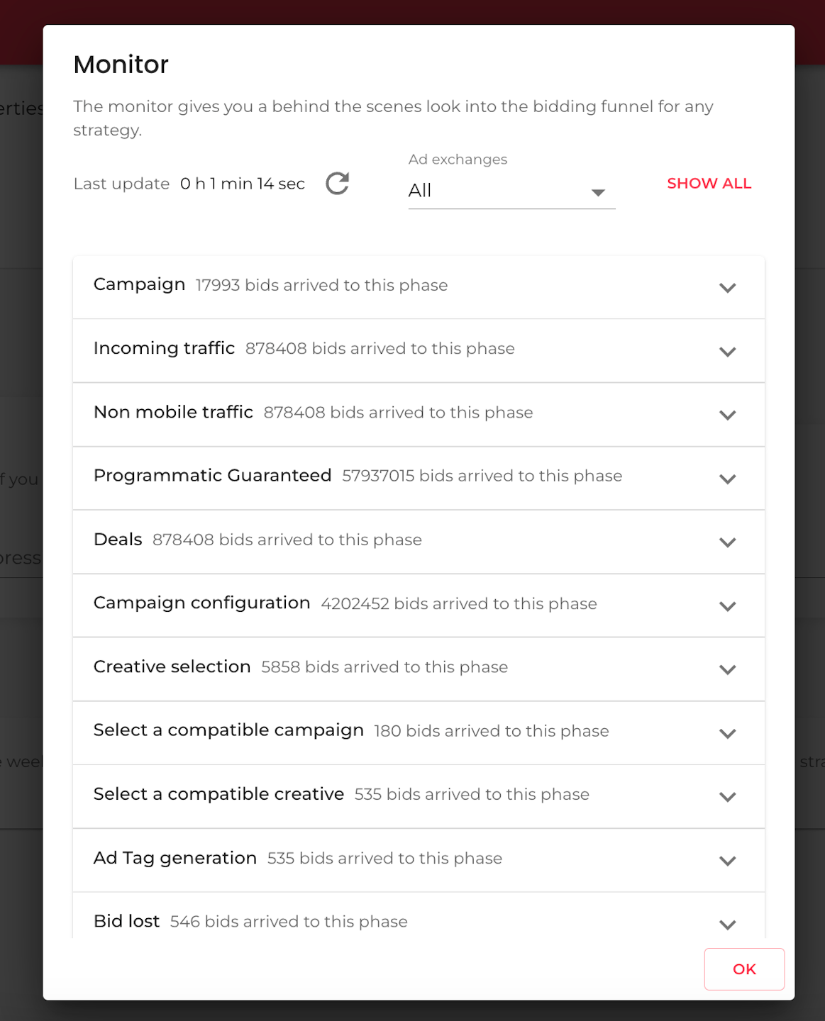 The Monitor gives you a behind-the-scenes look into the bidding funnel for any strategy. It can be a very useful troubleshooting tool, and also give you insights for configuration changes in your campaign.