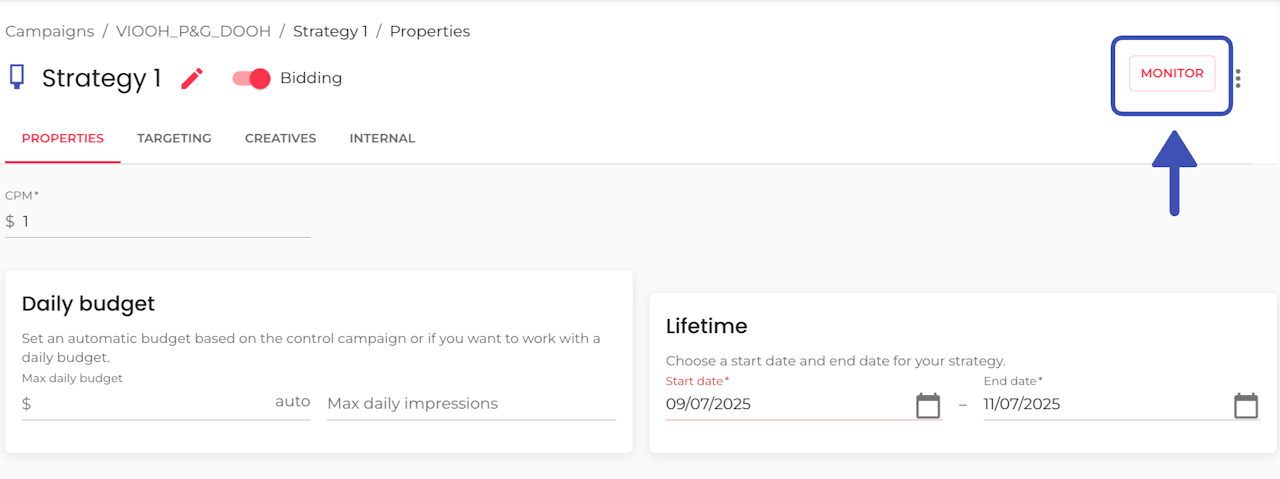 You can access the Monitor from each of the strategies in any of your campaigns, by clicking on the Monitor button on the top right side, as shown on the screenshot.